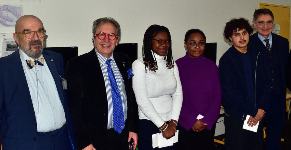 Pascal Franche, Président de Zone et grand organisateur de cet événement, Michel-Patrick Lagoutte, 2ᵉ Vice-Gouverneur élu du District Île-de-France Est entourant nos trois candidats, Ruth, Khadija, Ewen suivi de M. Delerue-Philippeau, proviseur.